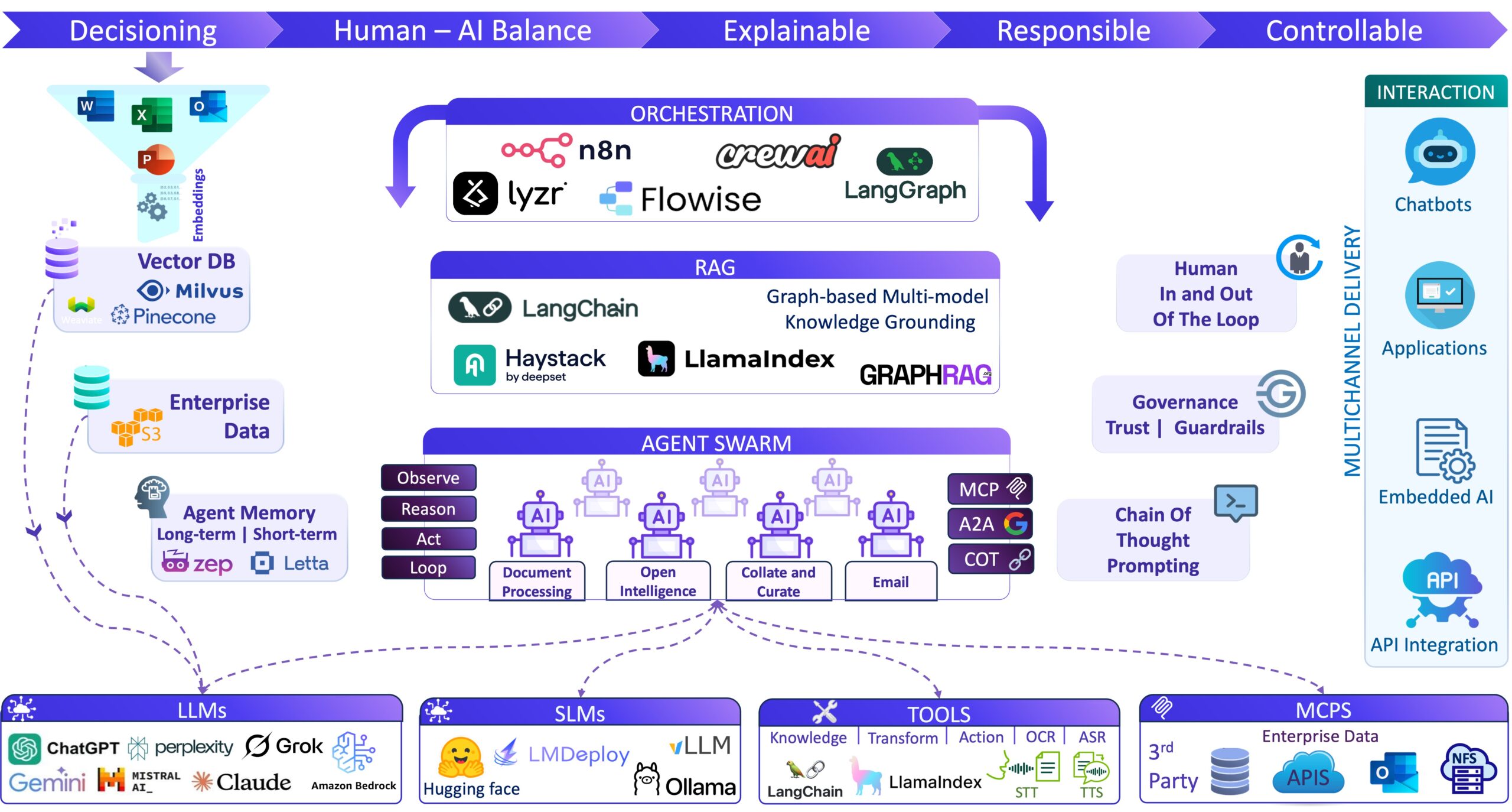 We work across leading LLMs, orchestration frameworks (LangGraph, CrewAI, n8n, MCP-enabled toolchains, etc.), RAG layer, and vector databases to build adaptive, performance-optimized solutions.