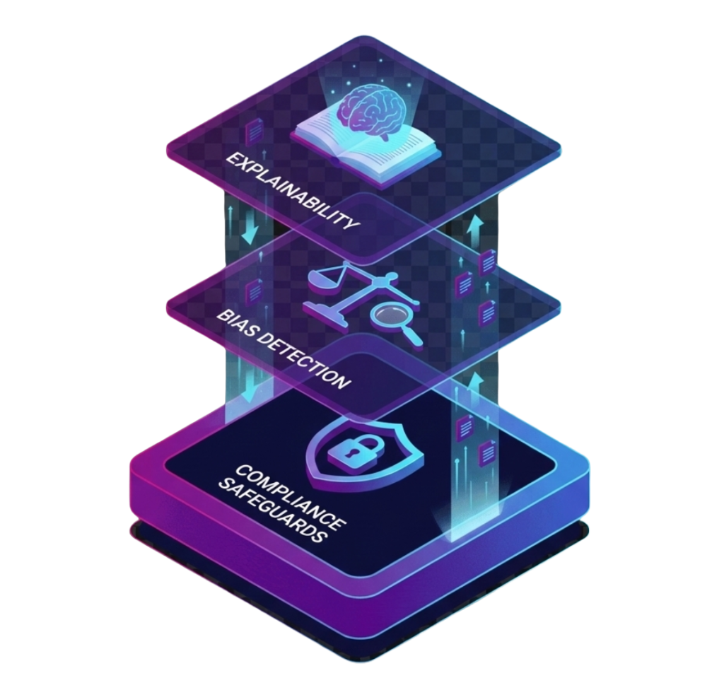 We embed explainability, bias detection, and compliance safeguards across all our solutions to ensure safe and ethical AI adoption.